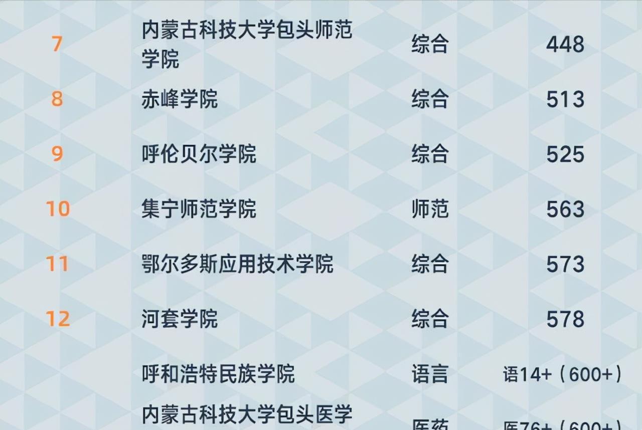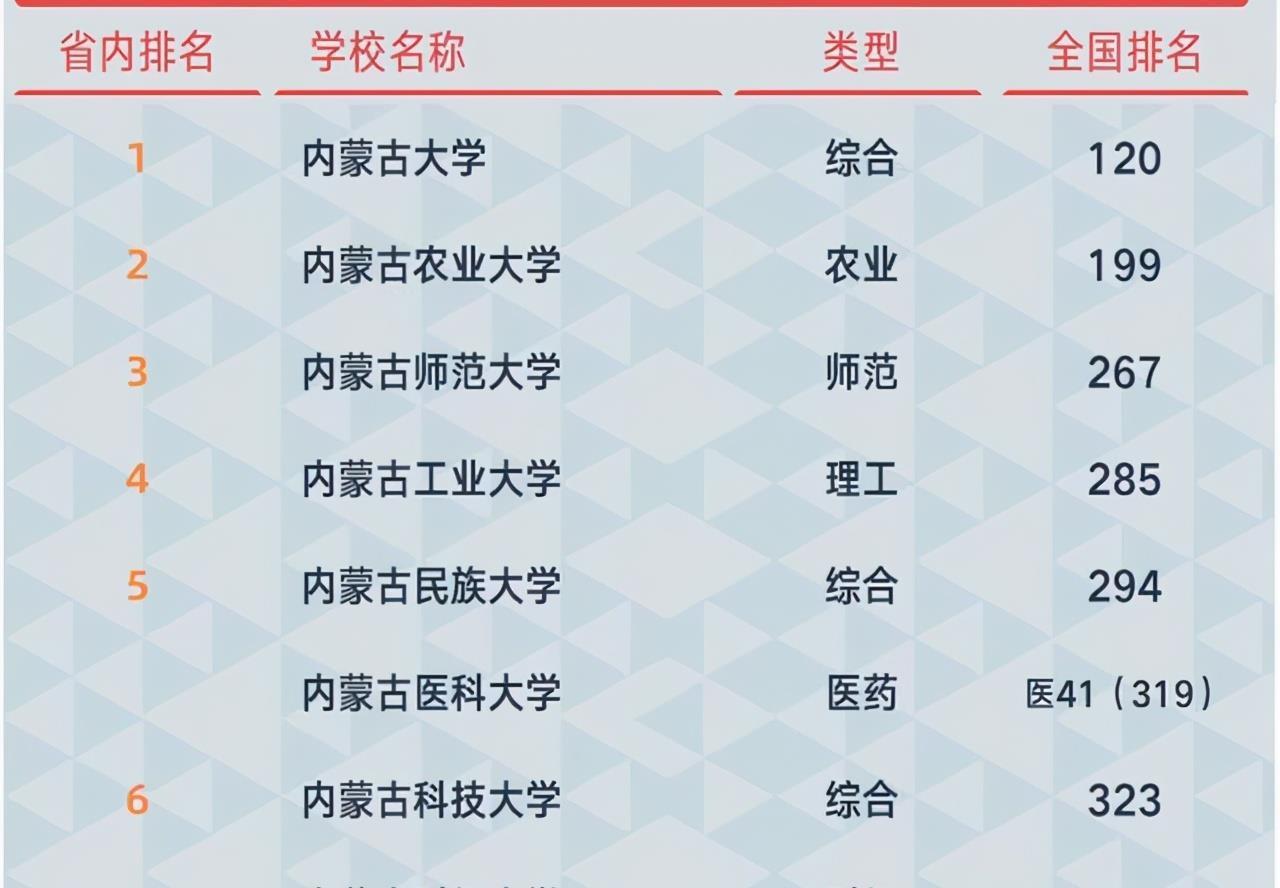 除内蒙古大学、内蒙古农业大学、内蒙古师范大学之外,排名相对靠前的内蒙古高校还有内蒙古工业大学、内蒙古民族大学、内蒙古医科大学、内蒙古财经大学等,是报考性价比相对较高的一批大学。